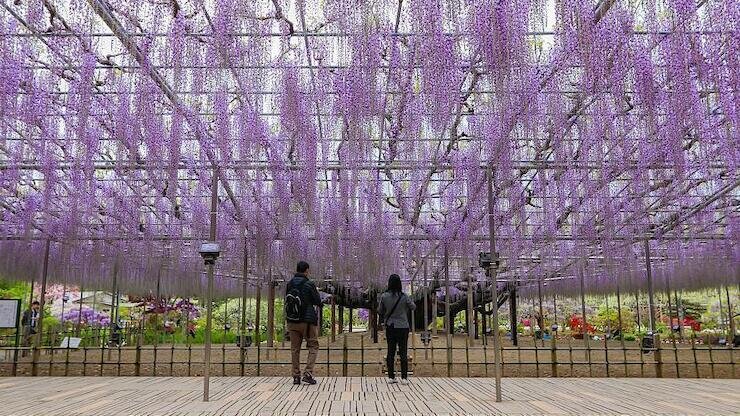 1. Цветочный парк Асикага в Японии — это место, где каждый смотришь на цветущие глицинии, как на живое чудо, особенно в начале мая. Это растение старше ста лет, и его ветви образуют веерный шатёр, который дополнительно поддерживают. Зимой глицинии превращаются в великолепную световую композицию.