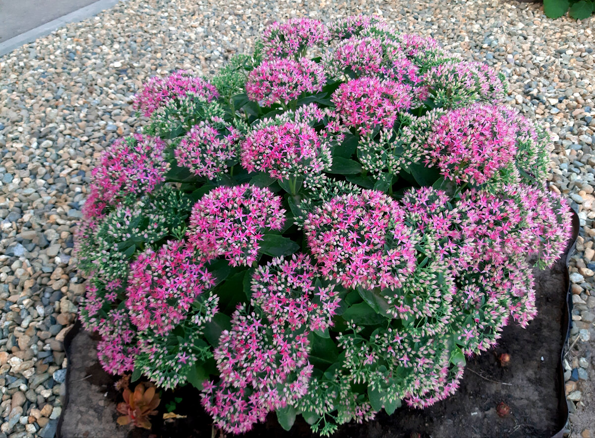 Этот сорт цветет с июля до осени, радуя глаз пышными розовыми соцветиями, которые постепенно становятся ярко-малиновыми. Очиток прекрасно себя чувствует на бедных почвах, поливать его можно крайне редко — дожди с легкостью обеспечивают ему необходимую влагу. Главное — выбрать солнечное место, ведь в полутени цветение будет менее обильным.