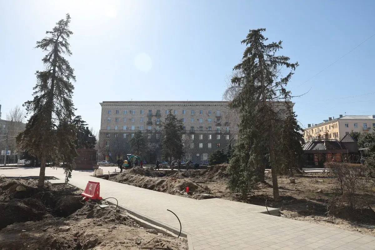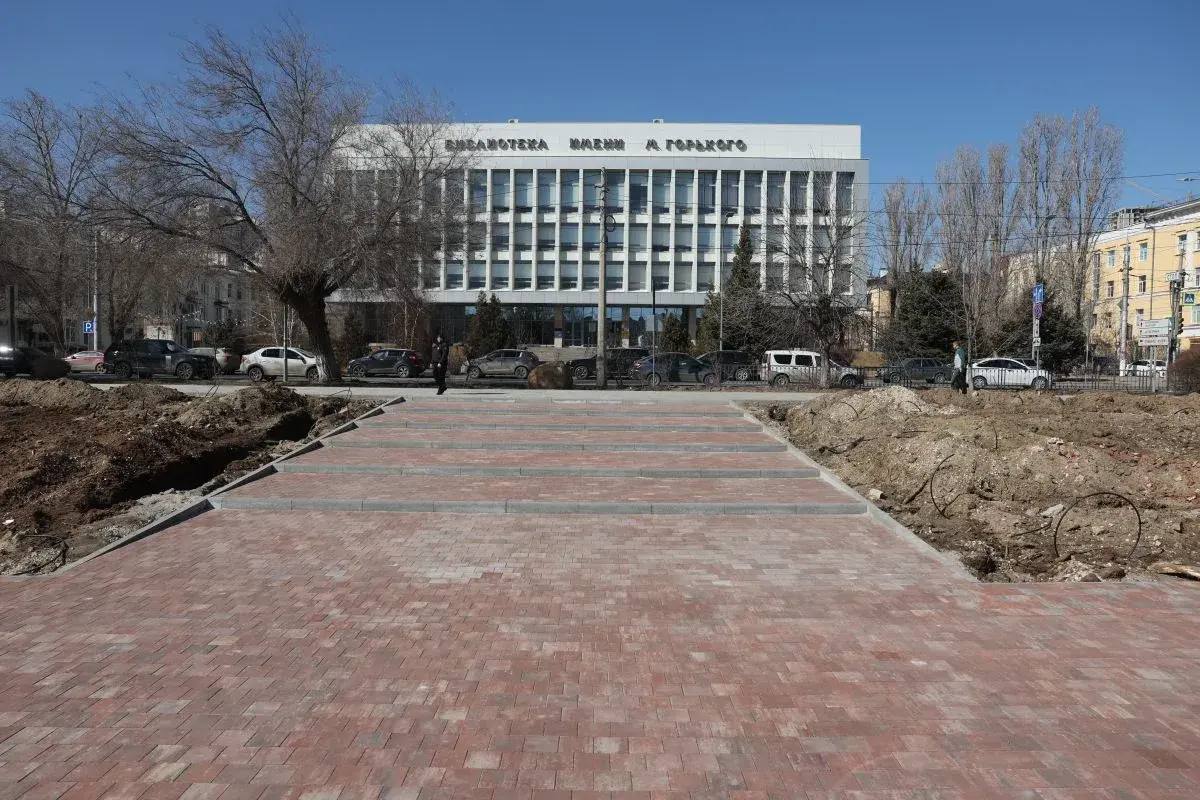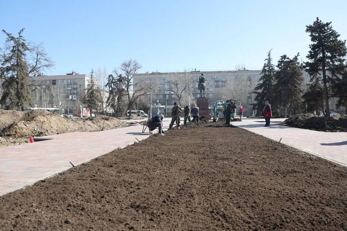 Общая техническая готовность составляет 60%. Здесь выполняется большой комплекс работ, в том числе укладывается современное тротуарное покрытие, монтируется система полива.