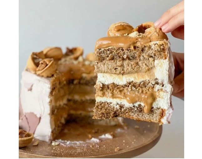 Смешайте яичные желтки с сахаром и орехами, взбейте белки до устойчивых пиков и аккуратно добавьте в массу. Готовую смесь равномерно выложите на корж и отправьте в духовку на 18 минут.
