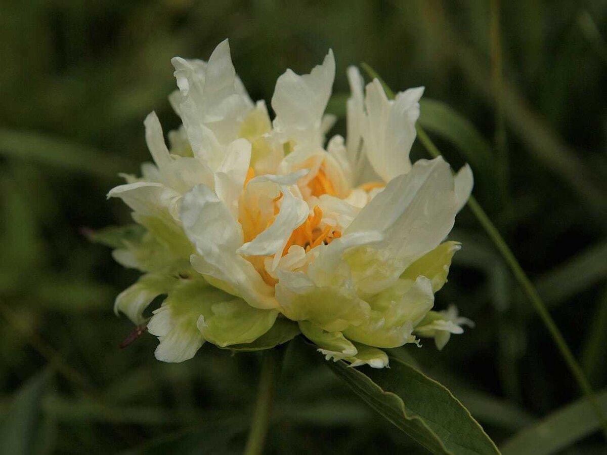 Цветок пиона 'Green Halo' отличается махровыми шаровидными формами. Внешние лепестки, бело-салатового цвета, обрамляют снежно-белые внутренние, поднимающиеся над ними и создающие эффект сияния благодаря крупной желтой серединке. Эти тонкие и немного помятые лепестки придают цветку своеобразный «разлетевшийся» вид.