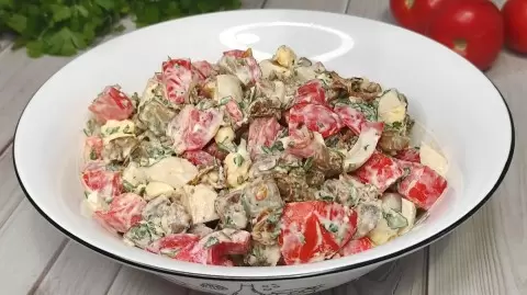 Все тщательно перемешать, и салат готов к подаче. Это блюдо не только порадует глаз, но и станет настоящим украшением стола. Приятного аппетита!
