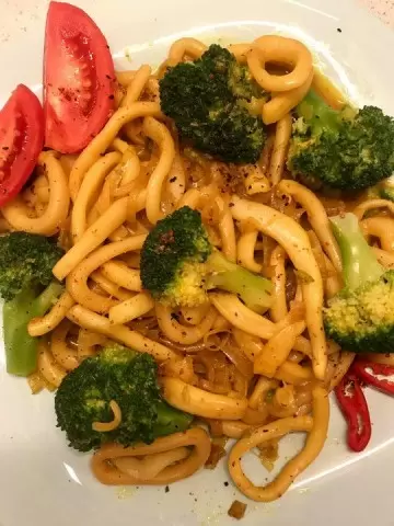 После этого к луку добавить нарезанные кальмары и обжаривать их на среднем огне в течение примерно 5 минут. Важно постоянно помешивать, чтобы не допустить пригорания. Затем добавить в сковороду соевый соус и специи, такие как куркума и смесь перцев, что придаст блюду выразительный вкус.
