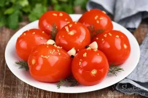 Каждый помидор аккуратно надрежьте и внутрь поместите листик кинзы и ломтик чеснока для аромата. Затем помидоры выложите в глубокую посуду, добавьте оставшийся чеснок и стебли кинзы. Залейте все теплым маринадом, накройте и оставьте на столе на 5-6 часов. После этого поместите в холодильник на 18-19 часов. Помидоры будут готовы всего за сутки, радуя своим сочным и насыщенным вкусом, благодаря добавленным специям и зелени.