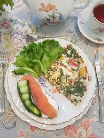 Когда омлет готов, его аккуратно раскладывают по тарелкам. В качестве презентации можно добавить свежие листья салата, а также преподнести с ним бутерброды, например, с творожным сыром и ломтиками сёмги. Такой завтрак станет не только сытным, но и очень стильным!