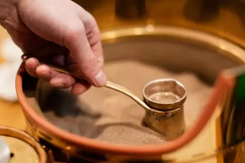 На раскаленном песке рождается кофе, который прогревается со всех сторон. Джезва дружно с песком держит тепло, постепенно наполняя напиток характером и нюансами, которых не достичь быстрым огнем. Бариста следит за движением металла и тишины вокруг, позволяя зерну раскрыться без спешки.