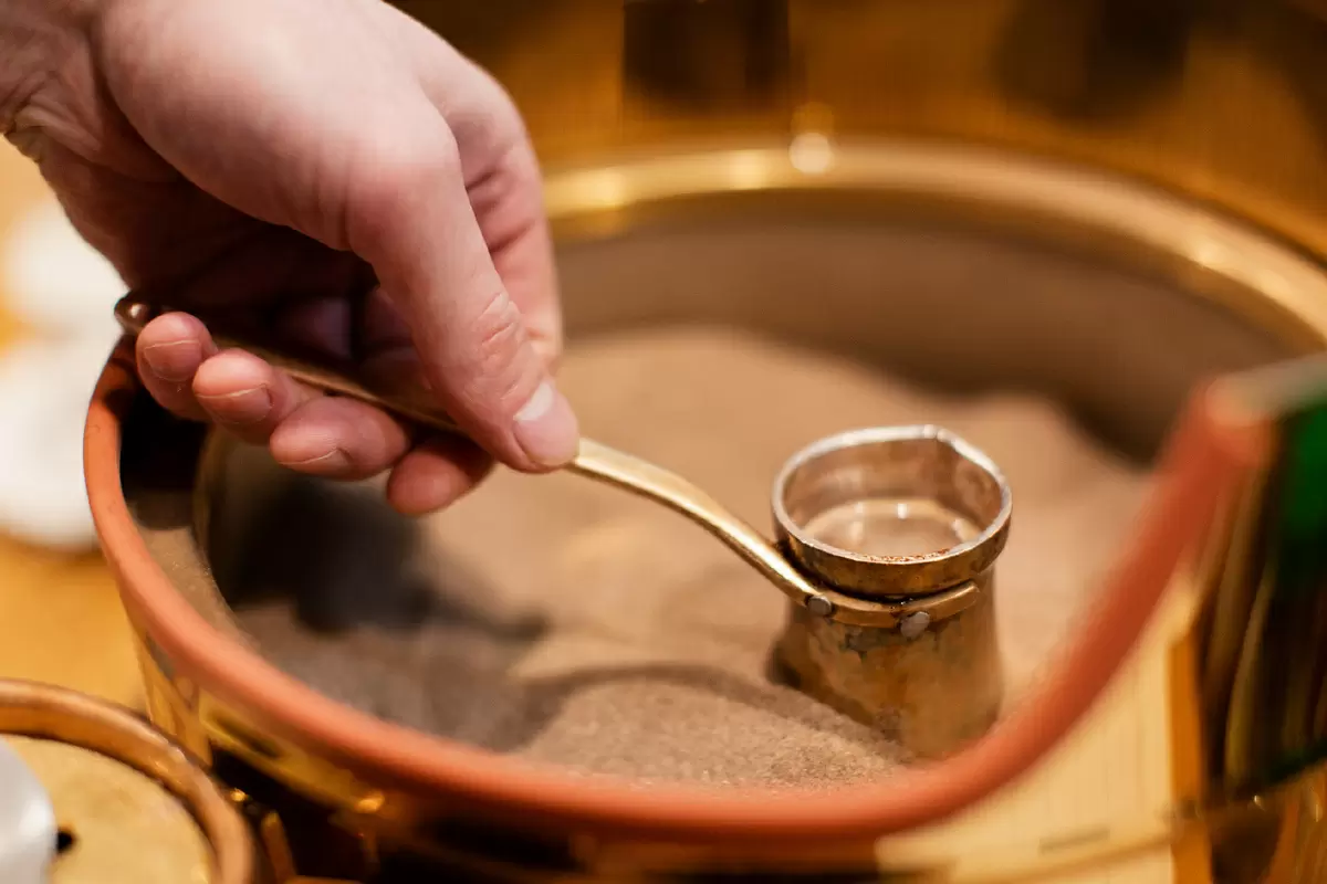 Песок равномерно обжаривает турку, создавая чистый и богатый профиль без резких нот. Это почти медитативный процесс: напиток не торопится, и каждый этап — часть впечатления. Джезву снимают и возвращают на песок, чтобы дать время напитку «выдохнуть» и снова набрать тепло.