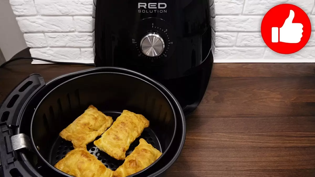 Готовые слойки располагаются в аэрогриле. Установив температуру на 200 градусов, выпекать их нужно около 13 минут. За это время тесто подрумянится, а начинка станет нежной и ароматной.