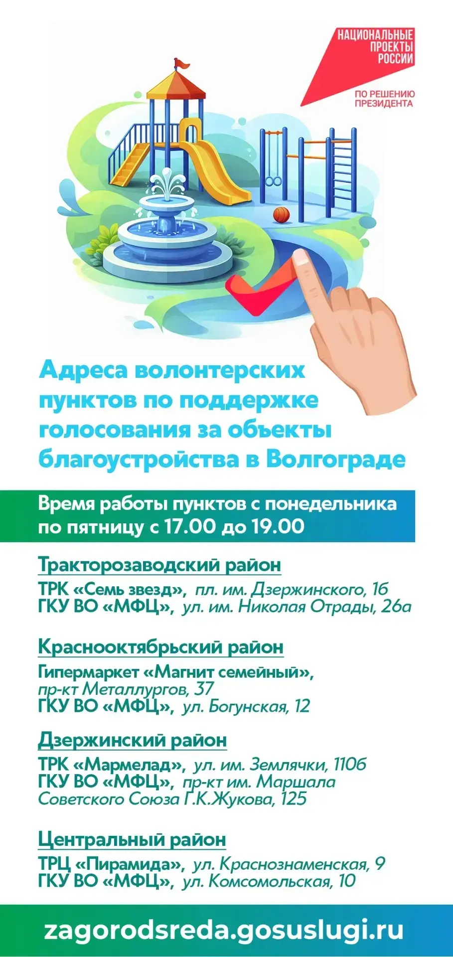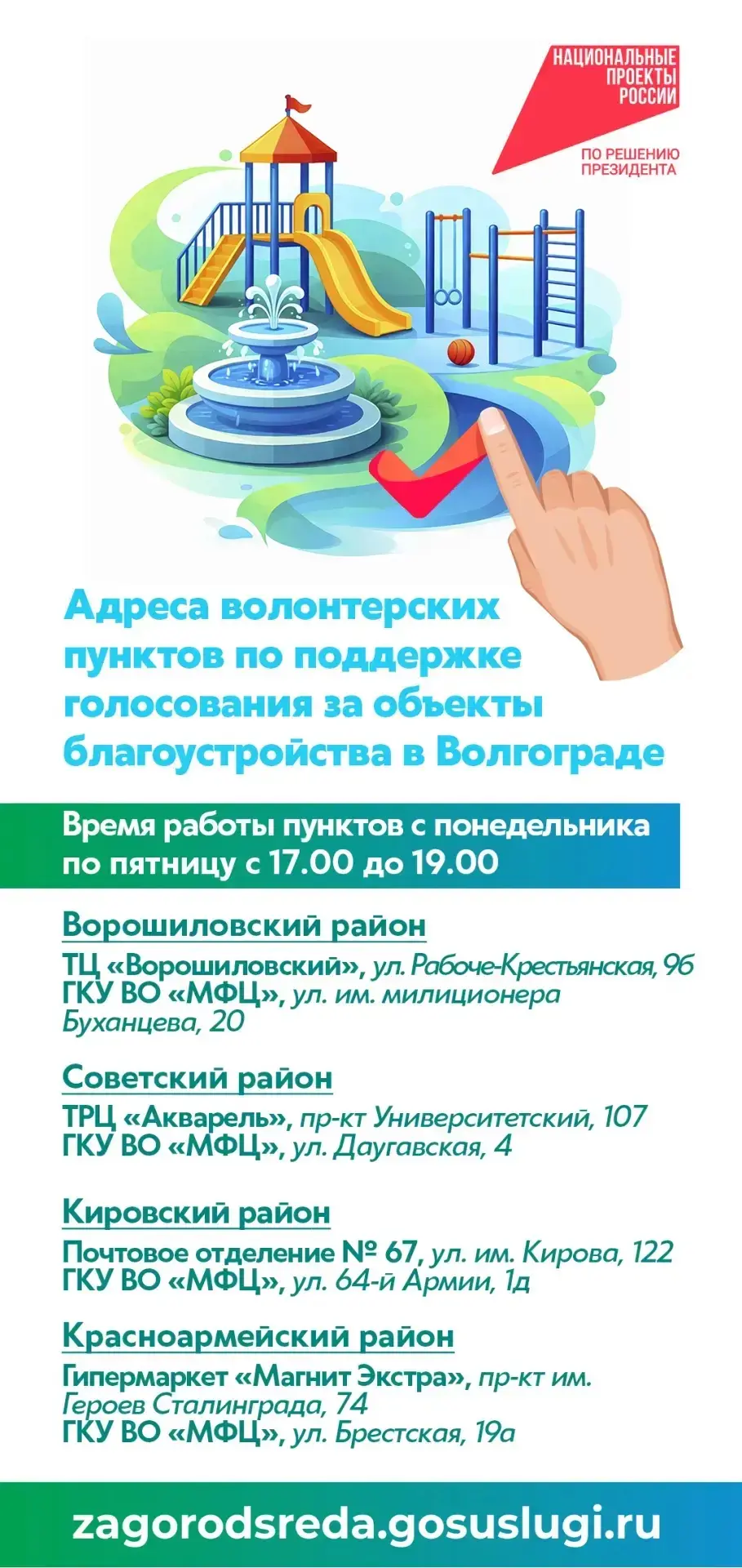 В ходе рейтингового голосования волгоградцы определяют очередность обновления парков и скверов в 2027 году в рамках нацпроекта «Инфраструктура для жизни» в 2027 году. Помимо помощи в регистрации на общероссийской платформ, волонтеры представляют всем желающим дизайн-проекты благоустройства территорий.