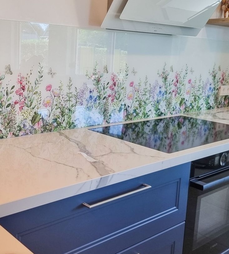 Представьте, как над вашими любимыми обоями с лавандовыми полями будет приятно видеть защитное стекло. Это решение идеально подойдет для стилей прованс и кантри. Крепкое закалённое стекло позволит сохранить красоту декора, не впитывая жир и воду. Эстетика здесь отличается мягкостью и теплотой, а уход за такой поверхностью вовсе не составит труда — достаточно будет просто протереть ее влажной тряпкой.