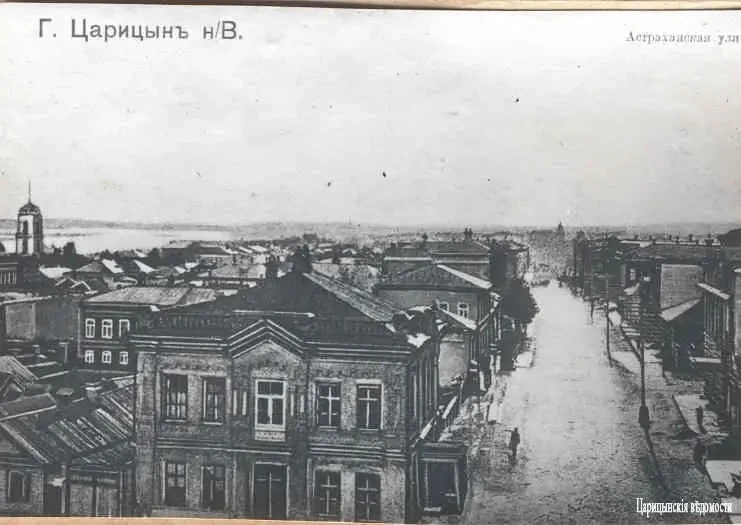 На фото - общий вид улицы Астраханской, снятый, предположительно, с колокольни Покровской церкви. Вдали видна колокольня Вознесенской церкви, которая находилась на месте нынешнего торгового центра. Сегодня улица Советская, повторяя трассу своей предшественницы, остаётся одной из главных магистралей Волгограда.