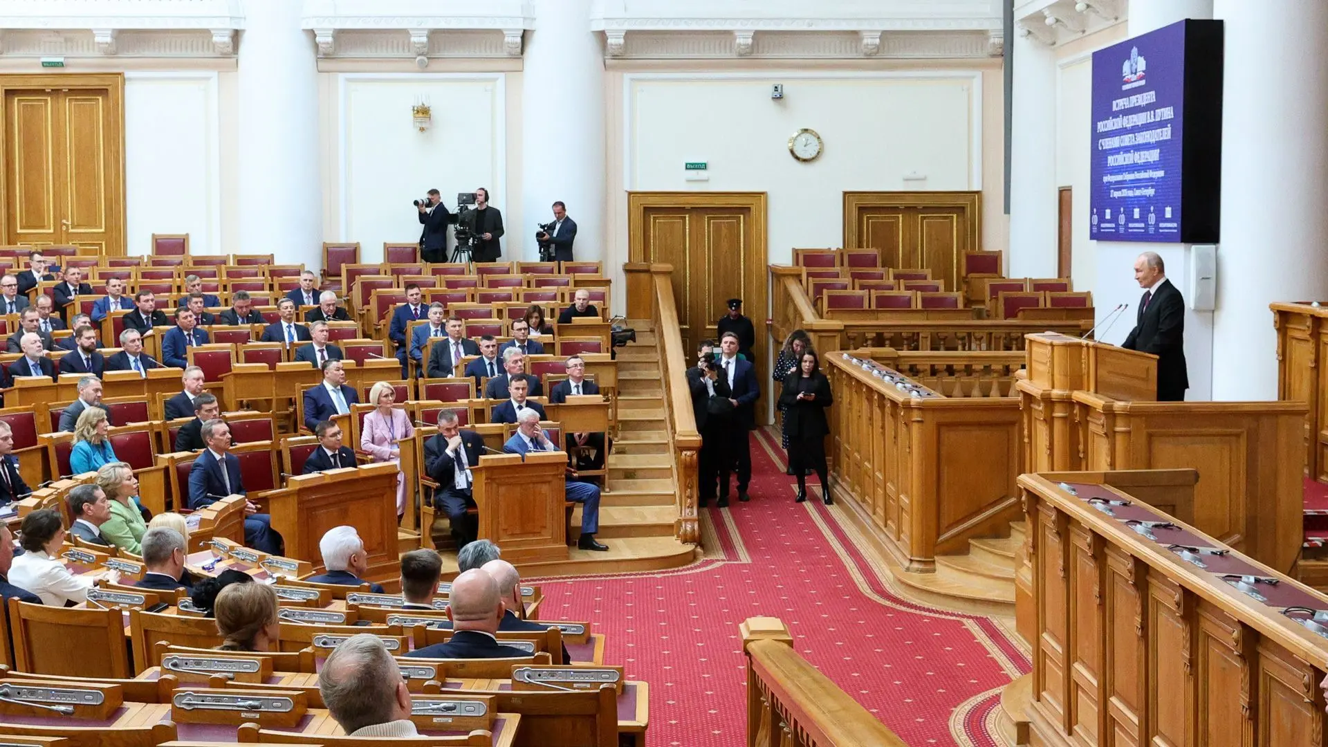 «27 апреля 1906 года именно в этом зале прошло первое заседание Государственной Думы. В ту эпоху сам факт ее учреждения, проведение выборов стали событиями колоссальной общественной, государственной значимости. Многие видели в этом новый этап развития страны, надежду на масштабные преобразования в России», – подчеркнул Владимир Путин.