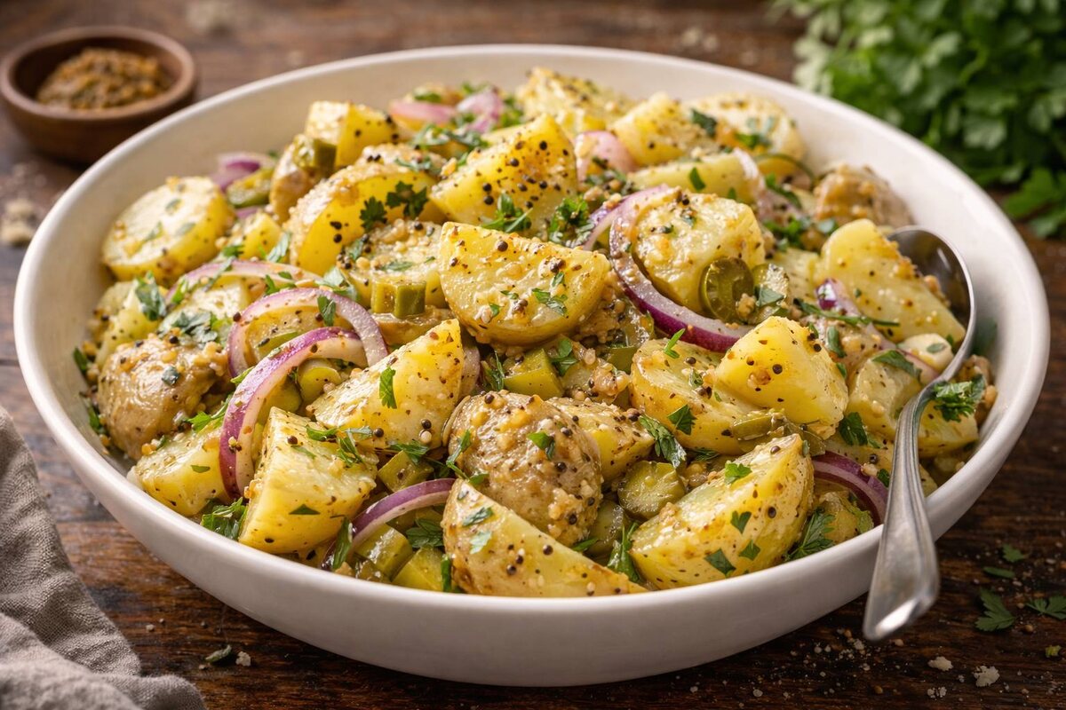 Собираем всё вместе: тёплый картофель с луком, огурцами и зеленью, заправленный горчичной смесью, создаёт впечатление продуманного блюда за считанные минуты. Вариант можно дополнить рыбой, беконом или яйцом, если хочется чуть сытности, но и базовый состав остаётся полностью самодостаточным.